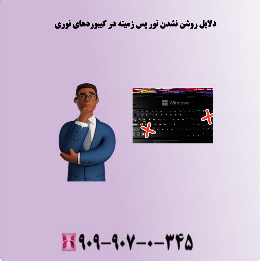 برای روشن نشدن نور پسزمینه در کیبوردهای نوری، با شماره ۹۰۹۹۰۷۰۳۴۵ ،بدون کد و پیش شماره از طریق تلفن ثابت (تماس از طریق موبایل امکان پذیر نمی باشد) تماس بگیرید و با کارشناسان به صورت شبانه روزی در همراه رایانه در ارتباط باشید.